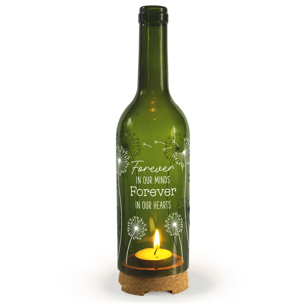 De waxinelichthouder is gemaakt van glas, is op ¾ doorgesneden en zit stevig vastgeklemd op een kurken voetje. Op de fles staan sfeervolle en persoonlijke teksten samen met mooie designs gedrukt in het wit weergegeven. In de voet van het product zitten luchttoevoer gaatjes waardoor waxinelichtjes goed kunnen branden in deze fles. Het product is geschikt voor zowel binnen- als buitengebruik. Tenslotte heeft het product een diameter van 5 cm en een hoogte van 27,5 cm.
